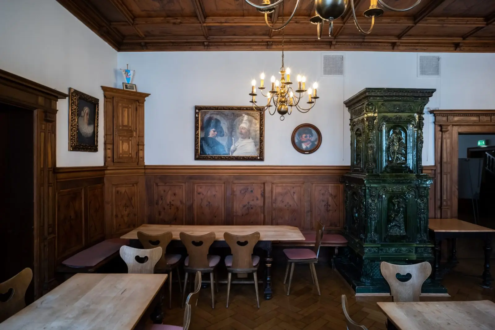 Das Philisterzimmer steht für bayerisch-bürgerliche Tradition in repräsentativer Ausführung. Aufwändige Holzvertäfelungen, ein historischer Kachelofen sowie rustikale Holztische, Sitzbänke und Stühle prägen das klassische Ambiente. Messing-Kronleuchter setzen stilvolle Akzente und runden den charaktervollen Gesamteindruck ab.